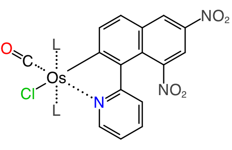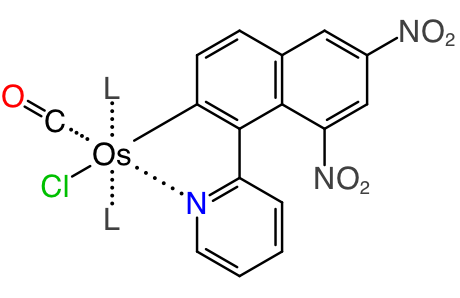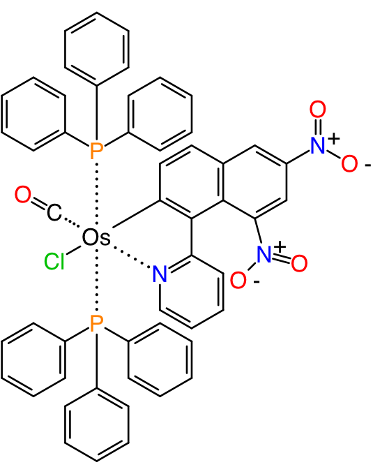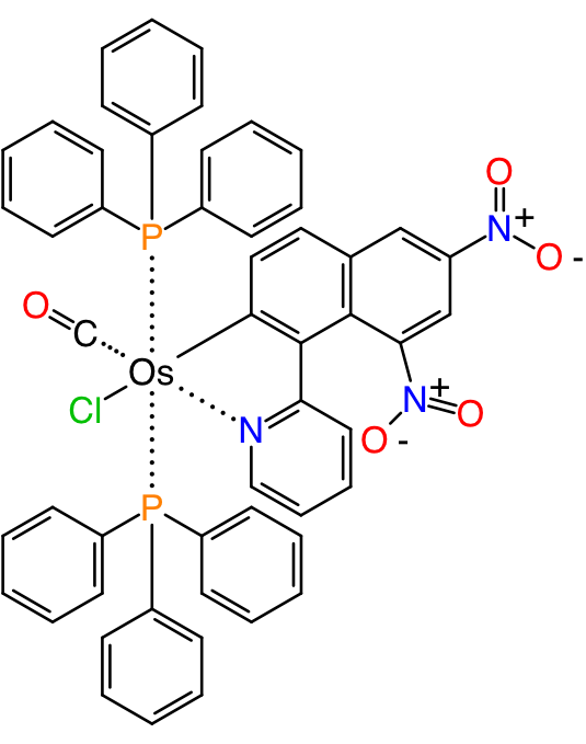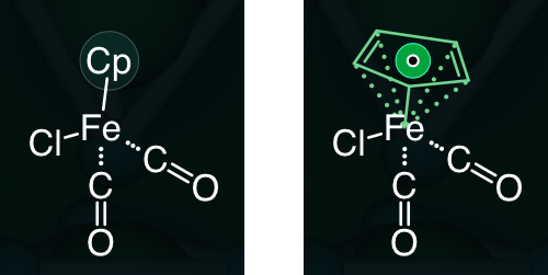 This is a clear and concise diagram, and it calls attention to the parts that matter: the coordination about the central metal, and the structure of the organometallic ligand, which is the point of the research. Now, if this same structure were to be drawn in a way that is complete from a cheminformatics point of view, it would need to include all of the heavy atoms, which would mean the best way to draw it would be more like this: