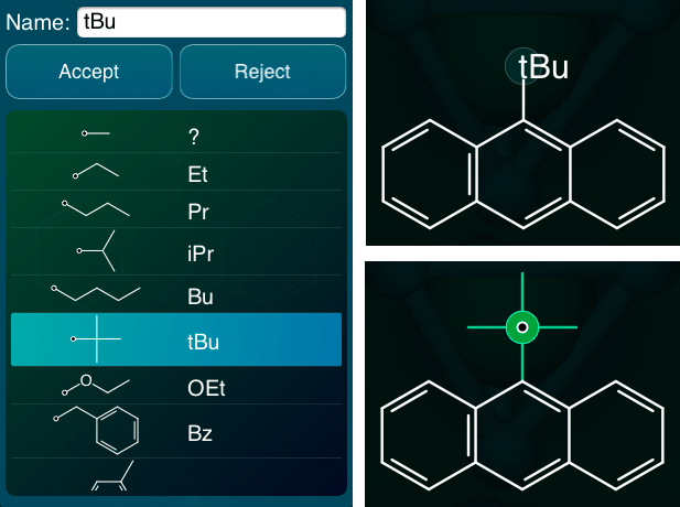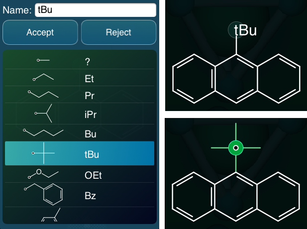 The structure is normally displayed as shown on the top right, i.e. the label of one of the “atoms” is tBu. When an abbreviation placeholder is the current atom, a full expansion of the abbreviation is shown in green, which is demonstrated on the bottom right, so from within the atom editor, it is easy to keep track of which atoms are abbreviations and what they stand for.
