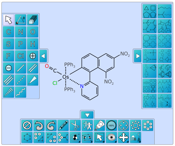 The toolbar on the left is a conventional tool palette which is recognisable to any chemist who has used a desktop software package to draw molecular structures. The bottom and right toolbars are suspiciously similar to the main menu and template groups provided by the MMDS structure editor for iOS and BlackBerry mobile platforms. Continue reading