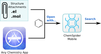 ChemSpider Mobile for iOS version 1.0.1 has been released (see AppStore, MMI, SciMobileWiki). The new version allows the app to be used to open chemical structures from arbitrary sources, which includes email attachments, web downloads, and other apps which implement the “Open with” functionality for chemical structure data: