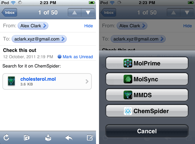 This functionality is not restricted to built-in iOS features like browsing and email. It is also available to any apps that choose to implement “Open with…” functionality. The Mobile Molecular DataSheet (MMDS) is one example of an app which provides this capability:
