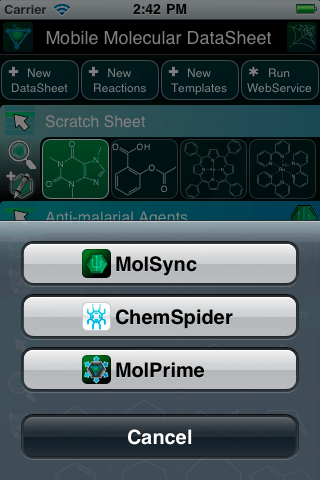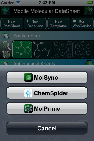This feature brings the ChemSpider Mobile app in line with a growing collection of chemistry apps, including the Mobile Molecular DataSheet (MMDS), MolSync, Reaction101, Yield101, Mobile Reagents and MolPrime, (see product page) that are capable of sending and/or receiving chemical data from one app to another, be it on the same device or via the Internet.