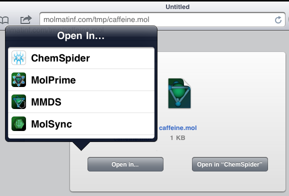 There are 3 main ways in which this functionality pops up in general use. If you are using Safari Mobile to navigate a website and stumble across a chemical structure (e.g. an MDL MOL file), an option similar to the following will be presented: