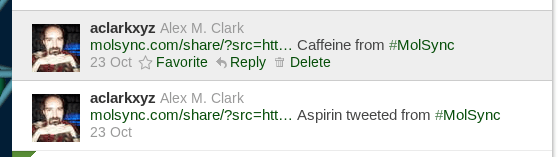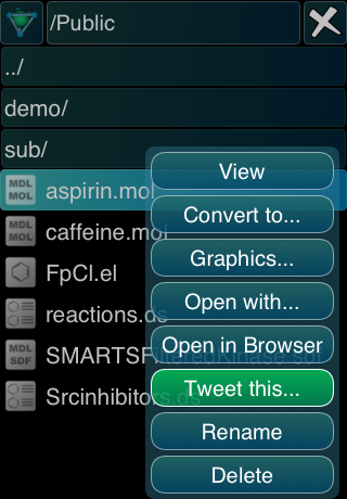 Earlier versions of MolSync provided a method for viewing public data by wrapping it up in a web page. This feature allows sharing of chemical data on a variety of social networking sites, but it is indirect, and the sharing is done from within the browser. The newest feature allows public data to be tweeted directly from within the app, simply by selecting a menu option, then keying in whatever text is to accompany the tweet.