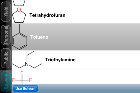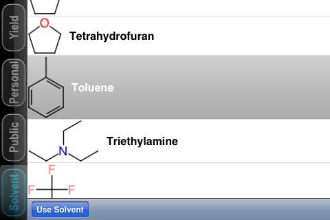 The Yield101 app introduced a list of solvents several releases back, which allows browsing of solvents and convenient addition as a reactant, with just a double-tap. Version 1.0.5, which has recently been released on the AppStore, includes density values for each of these solvents.