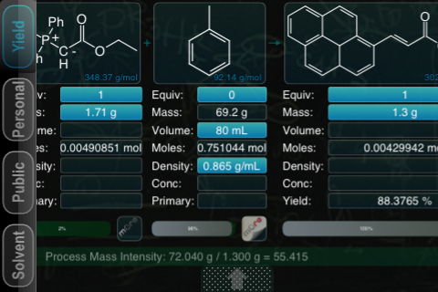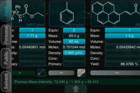 In the snapshot above, the toluene “reactant” has been assigned a density of 0.865 g/mL, which is automatically transferred from the solvent list. The volume of 80 mL was manually transcribed from the synthetic procedure. Note that because both volume and density are available, the mass is automatically calculated. This means that the Process Mass Intensity, which typically includes organic solvents, can be calculated for the reaction.