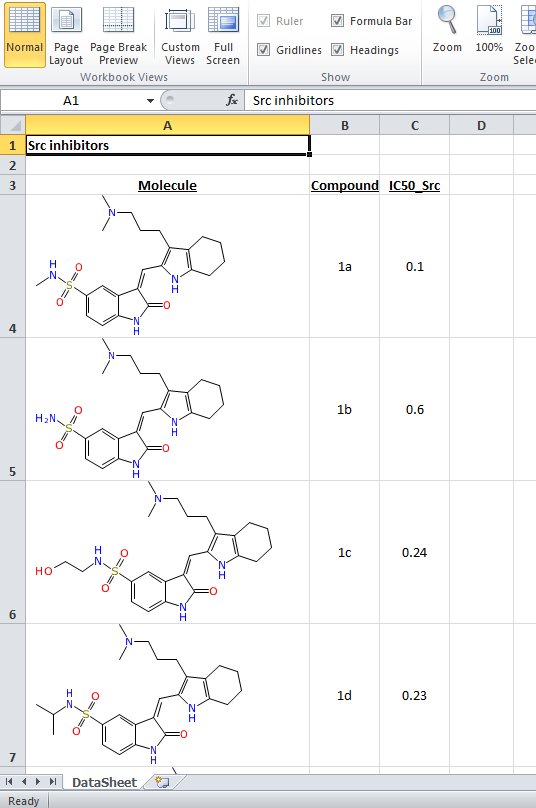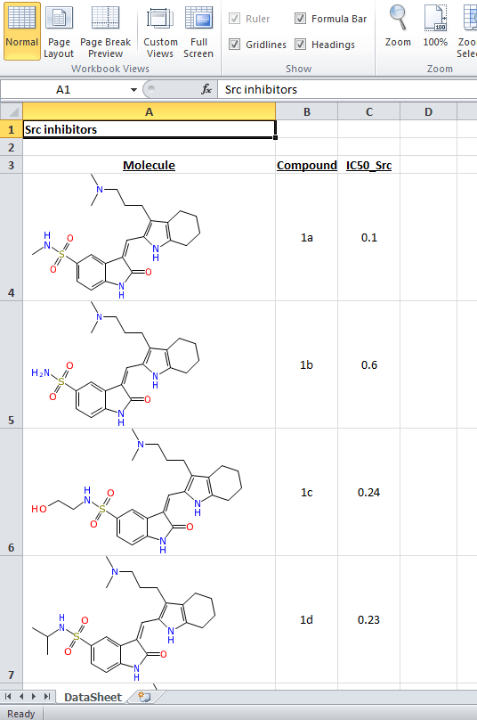 As can be seen, the tabular nature of the datasheet is carried over to the spreadsheet. Molecules are represented with vector graphics, which are associated with the cell, which has been sized to fit.