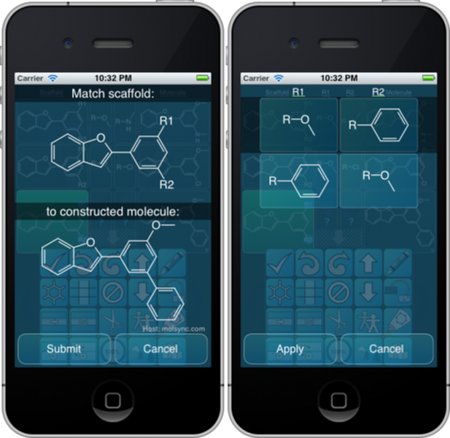 The matching is done by outboarding to a remote procedure call, so the specialised substructure search is not done on the device itself. The actual functionality goes quite deep into the heart of cheminformatics, and is tailored for the specific needs of this app. For example, the scaffold can be pre-decorated by substituents, e.g. R1, R2, etc., or if not, they will be created automatically. Symmetry and other forms of degeneracy are handled in various ways. There is often more than one way to label a scaffold and assign the substituents, and ultimately the user is offered a choice, with various ranking and pruning activities handled behind the scenes.