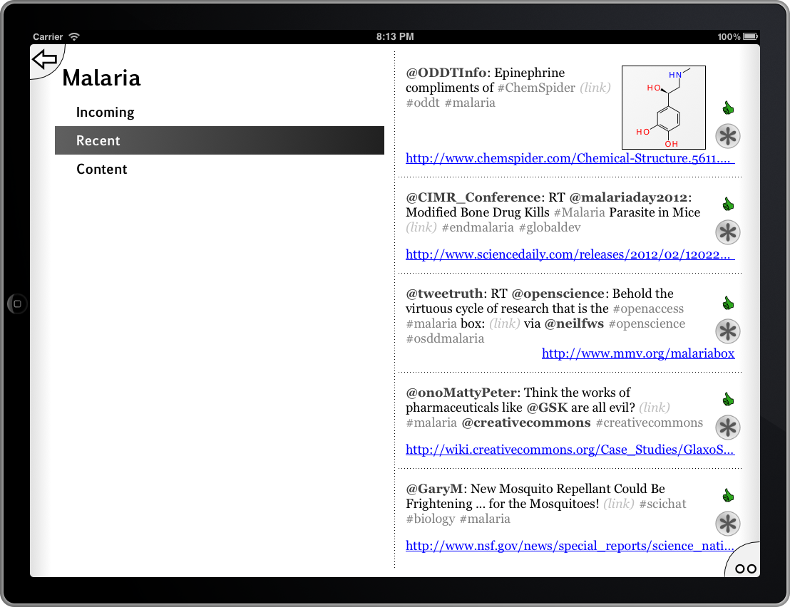 The latest feature to be added into the Open Drug Discovery Teams (ODDT) prototype is integration with tweeted links from ChemSpider. As can be seen on the picture to the right, the top-listed factoid has an inline picture of the molecular structure of epinephrine. The actual link itself goes to the ChemSpider page for that structure.