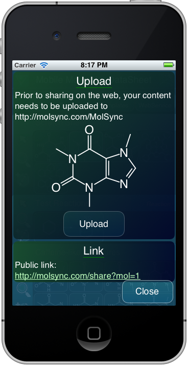 In the Mobile Molecular DataSheet app, the first exposure of this feature is a new menu item called Share on Web, which brings up a dialog as shown on the top right: the selected molecule/reaction/datasheet is shown along with an Upload button. On successful upload, the URL link to access the content is displayed underneath. Tapping on that link will launch a browser which goes out to display the shared data. The URL can be accessed by anyone, so it can be shared by any of the usual means. Anyone who has access to the page can view the data, and download it in a variety of cheminformatics and graphics formats.