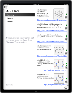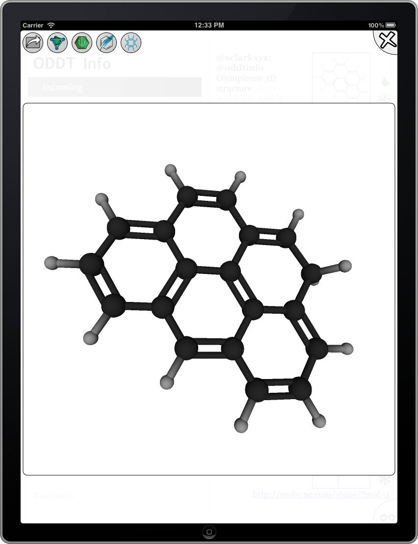 Given all the recent publicity about the timely novelty molecule olympicene, here’s another layer of gimmickry: using the latest version of the Open Drug Discovery Teams (ODDT) app for iOS (free download: iTunes AppStore), it is possible to view the 3D structure of the molecule on your iPhone/iPod/iPad. While most of the chemical structure content that can be browsed using this app is in the form of 2D diagrams, the latest version (0.9.3) added the ability to view 3D structures as well, making use of OpenGL ES.
