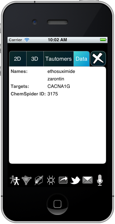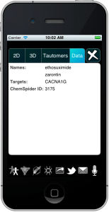 The Approved Drugs app has a new version awaiting review on the AppStore which adds drug targets and synonyms. The target codes have been integrated from the supplementary information of a recent Nature paper describing the prediction of side-effect targets (Lounkine, Keiser, et al), and provide data for 500 or so of the entries. Synonyms have been obtained by using the ChemSpider API, combined with some automated filters and manual verification to restrict the list to common trade names.