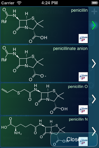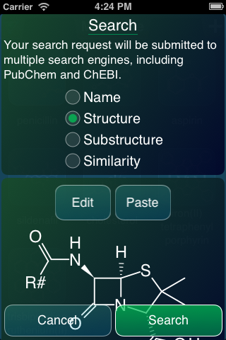Accessing the search functionality can be done in two ways: the “+” button at the top right of the app is used to add a new molecules, and now one of the options is to jump straight to the search query dialog. It defaults to text searching, so if you quickly type in the name of a compound, such as penicillin (shown to the right), you can obtain a list of matching entries: