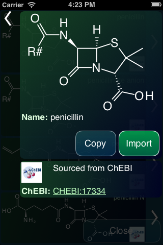 As when the search feature is used from the Mobile Molecular DataSheet app, the initial response is a list of compounds that can be swiped up and down. The option to import a collection of molecules as a datasheet isn’t available (since MolPrime+ has a simplified single-molecule focus), but opening up the detail view allows the compound to be copied to the clipboard, or imported as a new molecule:
