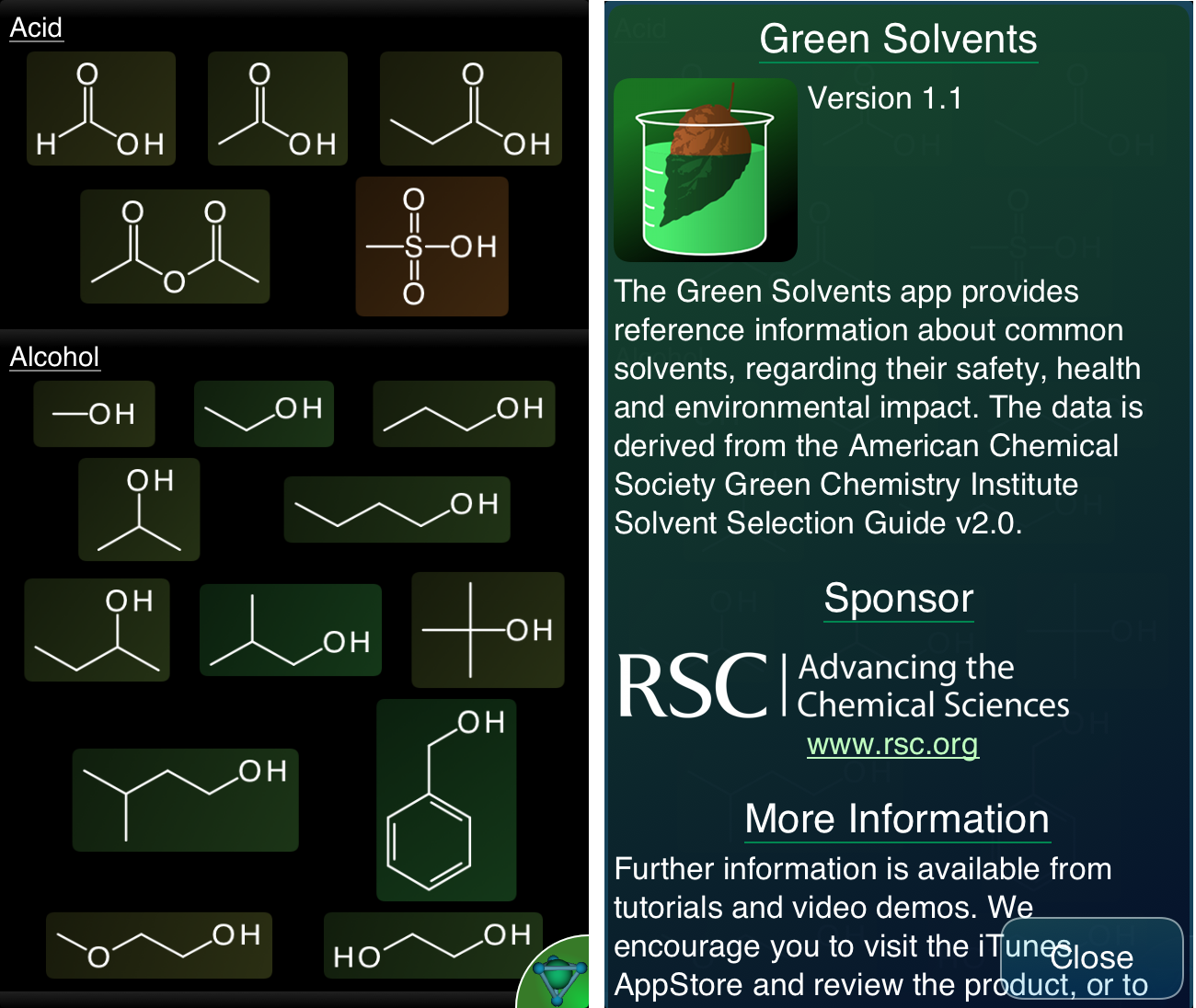 The latest version of Green Solvents (1.1) is now available on the AppStore. The first thing you’re likely to notice is that the banner advertising is gone. Take a closer look, and you’ll notice the acknowledgment that the app is now sponsored by the Royal Society of Chemistry. The Green Solvents app has been tied in with ChemSpider references from the outset. Given that the Royal Society of Chemistry owns ChemSpider, has a long standing interest in Green Chemistry, and an increasing role in the burgeoning ecosystem of mobile apps for chemistry, this is a natural progression.
