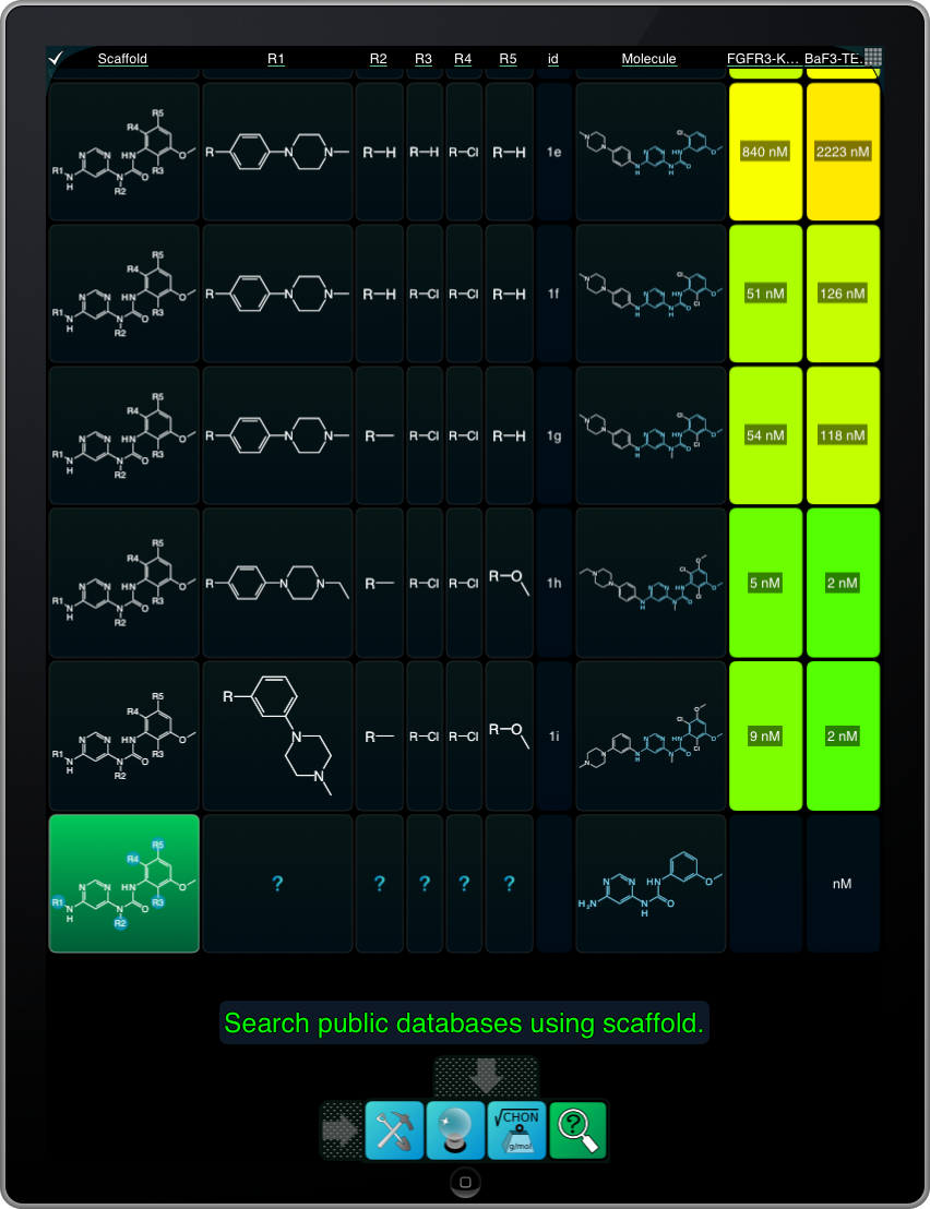 The third app to implement a front end for the new general search capabilities is SAR Table. This one works a bit differently, because instead of offering the standard name/structure/substructure/similarity quartet, it offers a fifth type: searching by scaffold template. Continue reading