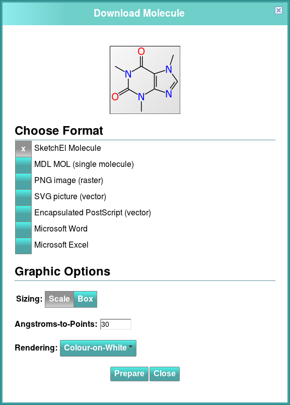 The dialog that pops up is able to offer a variety of format conversion features, because the page isn’t just a stashed bitmap, but rather it’s a live data representation of the molecule. It is rendered dynamically, and can be re-rendered to other cheminformatics formats, as well as other graphics formats. It is also possible to request sizes and colour schemes, to suit the purpose at hand (e.g. colour-coded atoms are often preferred for PowerPoint slides, while black-and-white is the norm for must printed documents). And all of this is available for free to anyone who wants to use it, the only catch being that the data is stored on the open web.