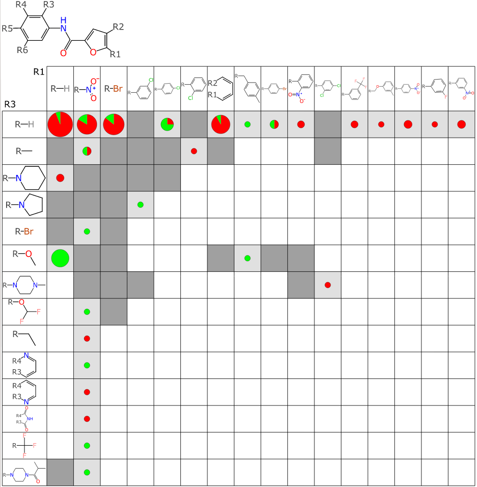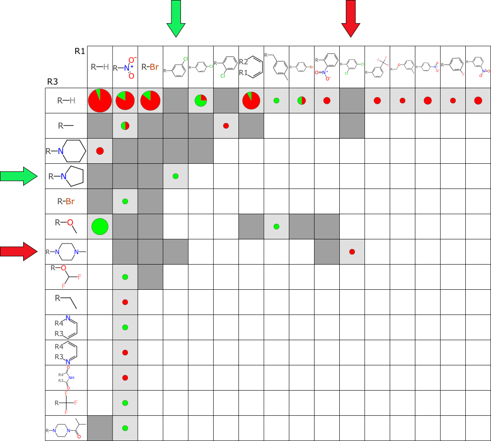 Note the green arrows: this row+column pair maps to the existence of a compound that has been measured as being active against TB. Both the row and column to which it belongs have a number of instances where at least one additional compound with the same scaffold and R1 & R3 fragments are known, which suggests that there is a good chance that one of these might also be active. The red arrow on the other hand hints at the opposite possibility: if you had to guess, you might say that compounds that match this row+column would likely be inactive.