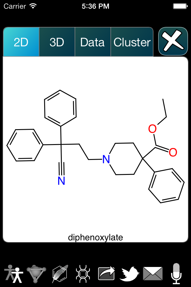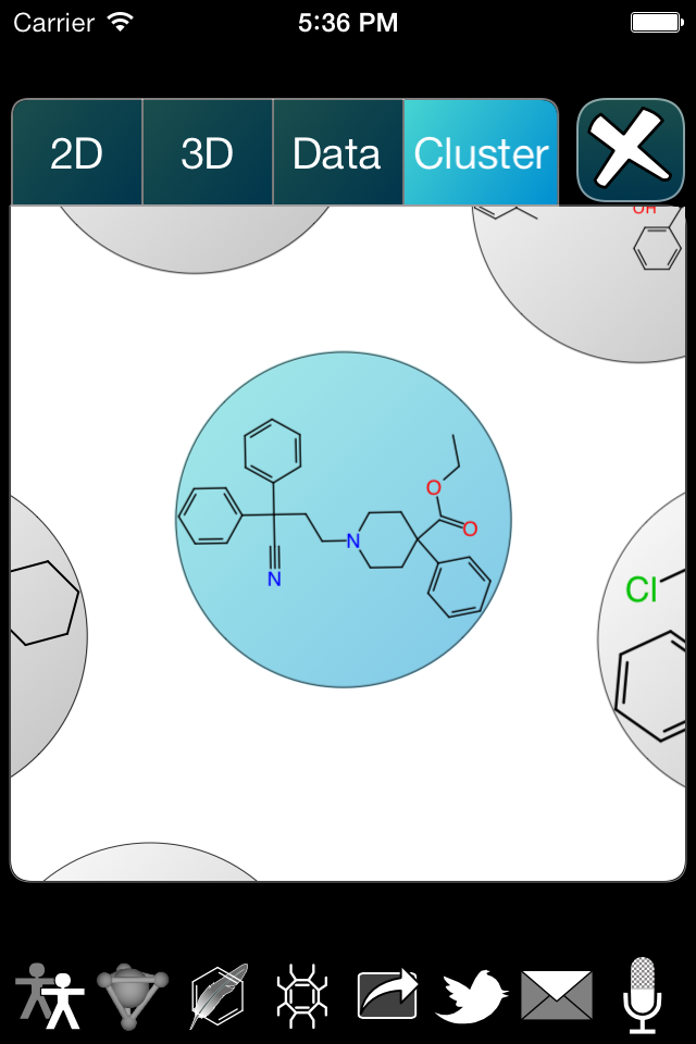 The app itself is based on a simple concept: provide a list of some of the FDA-approved drugs, and display them by structure in a browseable list. The list can be scrolled up and down, and tapping on any of the structures reveals more detail information. As of the newer version, the types of content that can be viewed includes a tab called cluster, which displays the selected drug in the centre, with structurally similar drugs arranged in proximity: