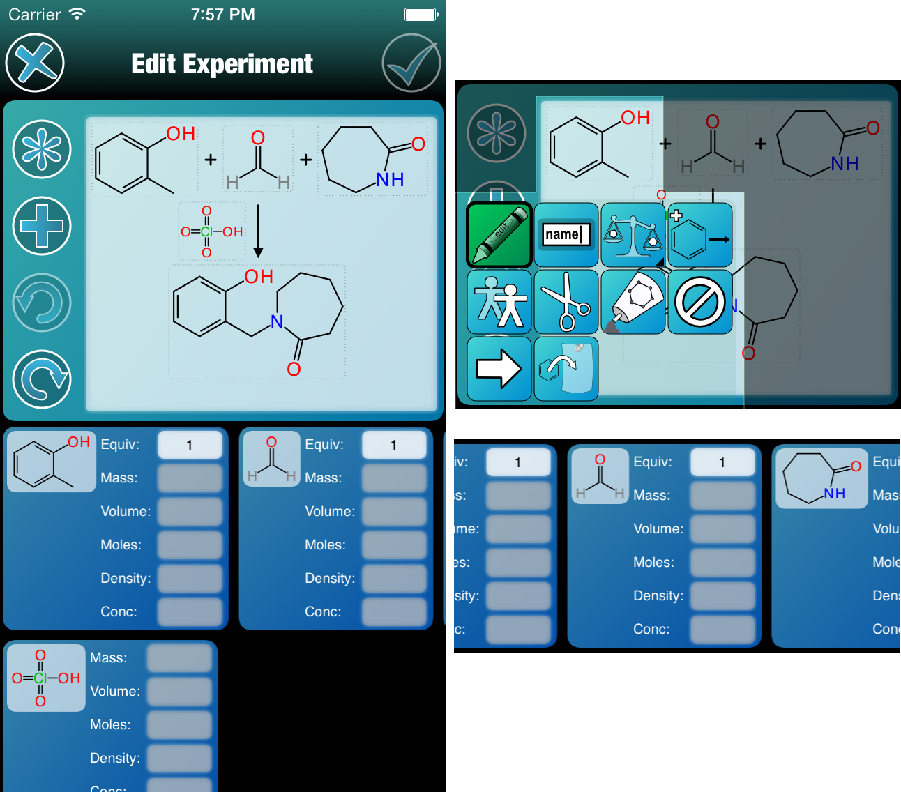 For the user interface of specifying an experiment, it is all component-based (as opposed to a freeform canvas like most PC-based chemical drawing packages). One of the lessons learned from creating apps, which is obvious in retrospect, is to keep almost all of the main functionality accessible on the current view. So the main area, which shows the reaction pieces, turns each of the reaction components (reactants, reagents and products) into buttons. Tap on any of them, and a context menu comes up: all the add, edit, delete, move, modify commands are available. Double tap and go straight to the editor. When there’s no component at a reaction stage, an icon with “?” is shown, and tapping on that allows creation of a new entry.