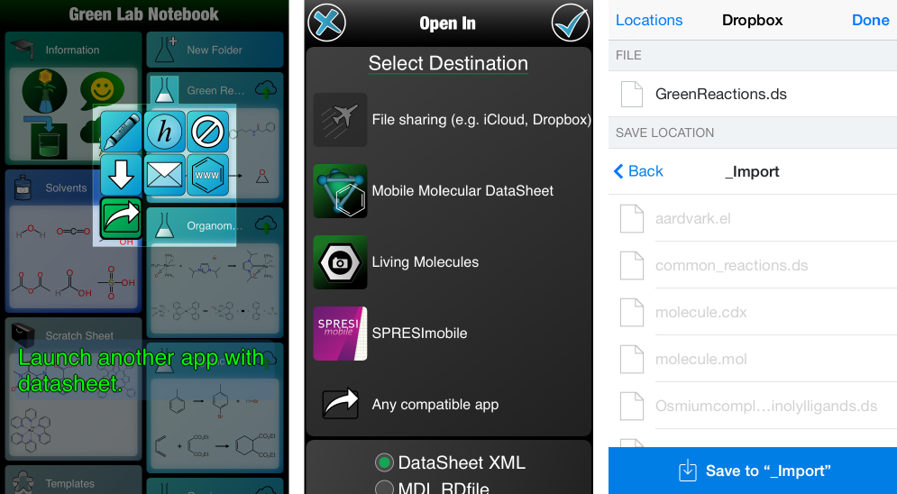 The new import icon, when pressed, asks the system to present a list of potential providers, which on my devices currently includes iCloud and Dropbox (but for all I know you may have a whole suite of other providers installed on yours). The inline browsing dialog allows navigation through folders and selecting individual files, in this case a datasheet with some experiments that were curated from my Ph.D. thesis. The final import dialog asks where to place the newly acquired content, within the hierarchy that the Green Lab Notebook uses to present its various flavours of chemical data.