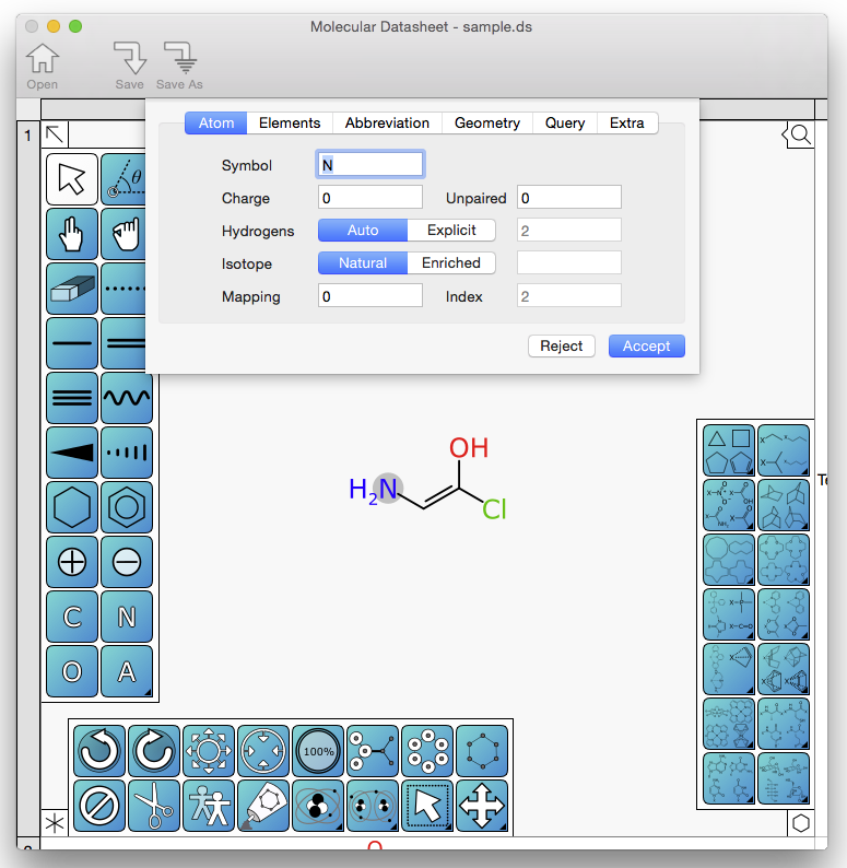 Normally I wouldn’t consider a trivial dialog box to be worthy of a blog post, but it’s as good a time as any for a progress update on XMDS. The sketching interface for editing molecular structures is now somewhat feature complete. There are a few bits to come back to, but in general the methods for adding, deleting, editing and aligning atoms and bonds are available in a highly redundant way. By redundant, I mean that in a good way. The editor is based on a confluence of methodologies that I’ve built out in various products over the years: (1) the conventional way of drawing molecules with a painting-style toolbox (see SketchEl); (2) the “drawing primitives” designed for precise editing when user interaction is expensive, motivated by mobile devices with tiny screens; and (3) keyboard shortcuts, designed so that an expert can draw molecules incredibly quickly without having to reach for the mouse, battle-tested with the BlackBerry version of MMDS back in 2010, when touchscreens were not yet ubiquitous. Continue reading
