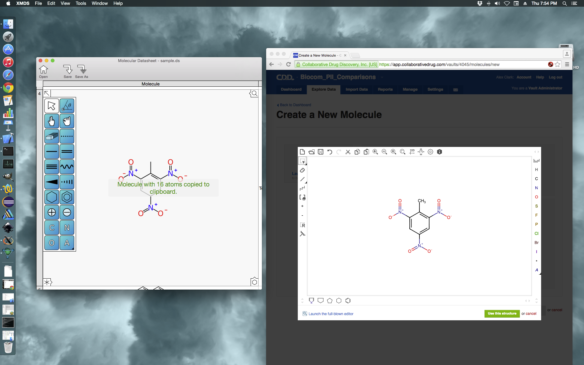 It may be a slightly arbitrary milestone, but the Mac app-in-progress XMDS has performed the first instance of a deed that might be argued as being useful. Most of the sketching functionality is now operational, which combines pretty much all of the drawing capabilities of the MMDS app and the SketchEl desktop structure drawing tool, as well as a few new ideas. The feature that was added today is clipboard interoperability, which means that structures can be used elsewhere. In this screenshot, the structure has been pasted into an instance of CDD Vault in the browser, in draw-new-molecule mode.