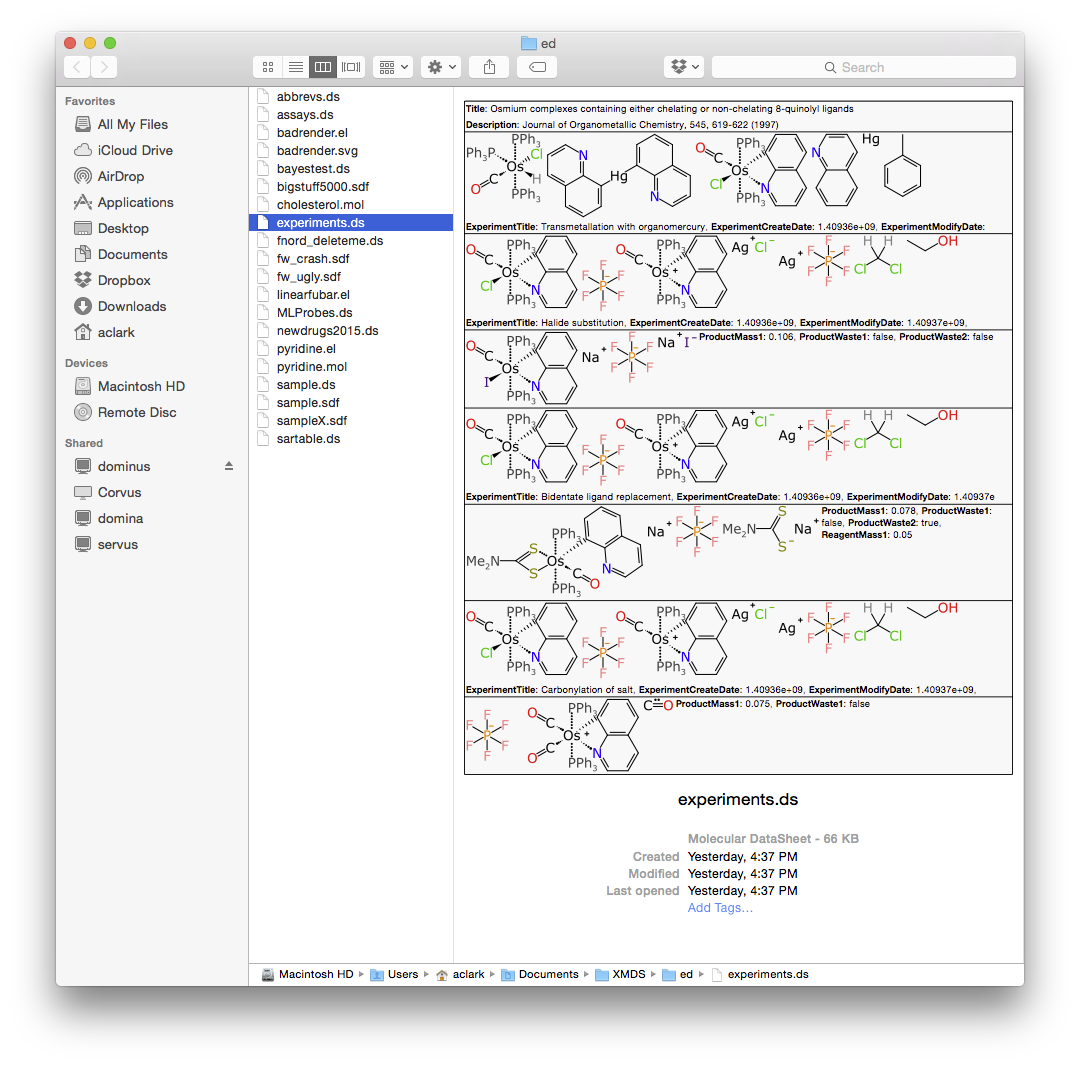 The Mac OS X platform has a somewhat involved technique for allowing apps to integrate themselves with the Finder. Whenever you click on a file, it typically shows you a preview, if you have one of the applicable viewing modes enabled. If you hit the space bar, the preview pops up in magnified form. The previewing process can be supplemented by custom applications by creating what is called a “QuickLook plugin”, and XMDS now supports one of these. Once it is installed, the contents of chemical datafiles – molecules and collections thereof – can be viewed very conveniently indeed: