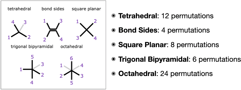 For the most part, dealing with these geometries is about as tricky as one would expect, for someone with a moderate amount of experience in coding up such things, if and only if there no pesky rings and the substituents distinguish themselves by compositional equivalence. By which I mean that in cases where ligands that are different have different atom & bond connectivity, and they’re not connected to each other, then it’s a pretty routine problem to solve. That’s the case for the bulk of stereo-active coordination complexes, and not so for a vast long tail that stretches out from here to infinity (or thereabouts).