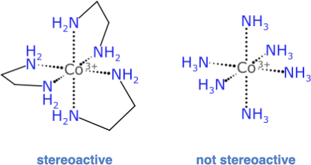 The complex on the left with 3 ethylenediamine ligands has an enantiomer: its mirror image is not superimposable; but the compositional equivalence of the 6 ligand attachment points suggests that it has the same ultra high symmetry as the complex on the right. But this is not so, because it matters which order these bidentate ligands are traversed in. For the hexammonium complex, though, picking any atom traversal order will give the same final result.