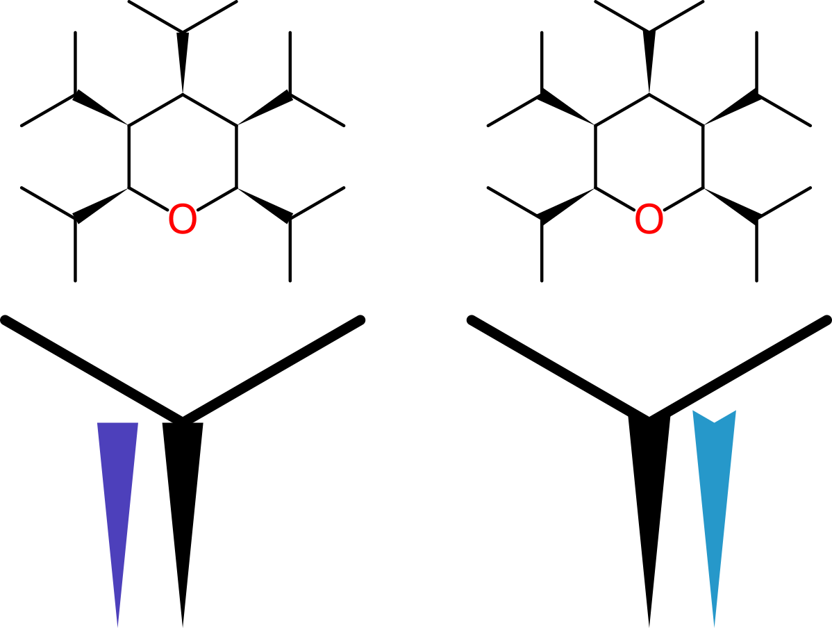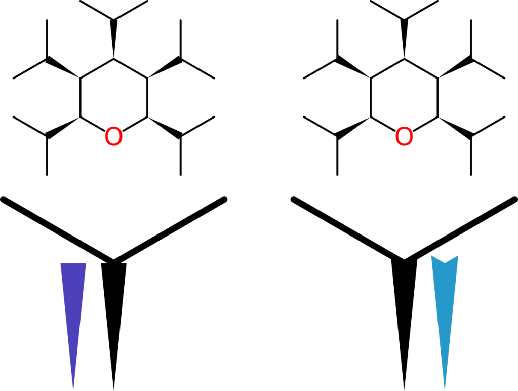 If you look carefully, the structure on the left has a wedge bond that terminates in an isosceles triangle, and has two single bonds emerging from it, which leaves a little gap. It’s not exactly the most annoying thing in the world, especially not at the resolution normally used for diagrams. But nonetheless wouldn’t it be a little bit nicer if it looked like the version on the right, where the wedge bond is shaped more like a chevron, and hugs the two bonds…