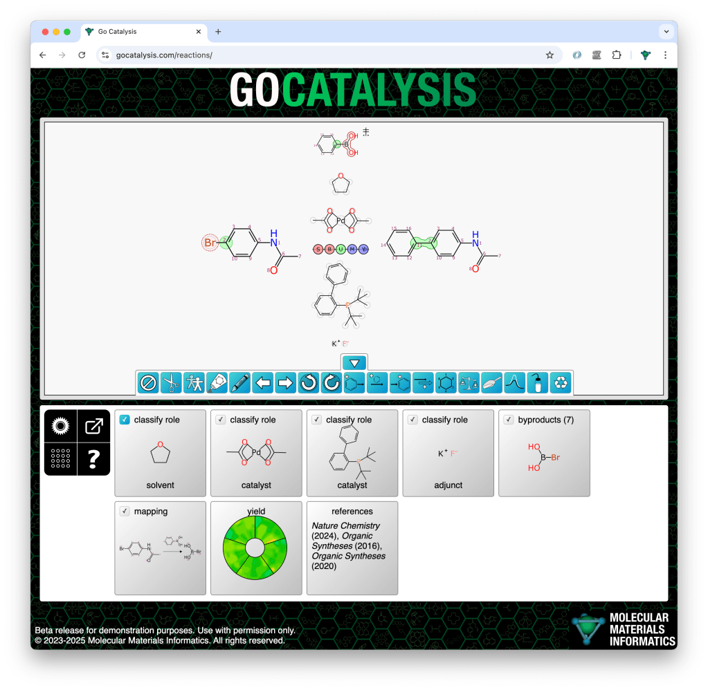 Once the reaction scheme components are all present and marked up, the last step in this toolchain is to propose a coarse-grained set of conditions, namely the duration, temperature and catalyst concentration that is likely to provide the best yield.