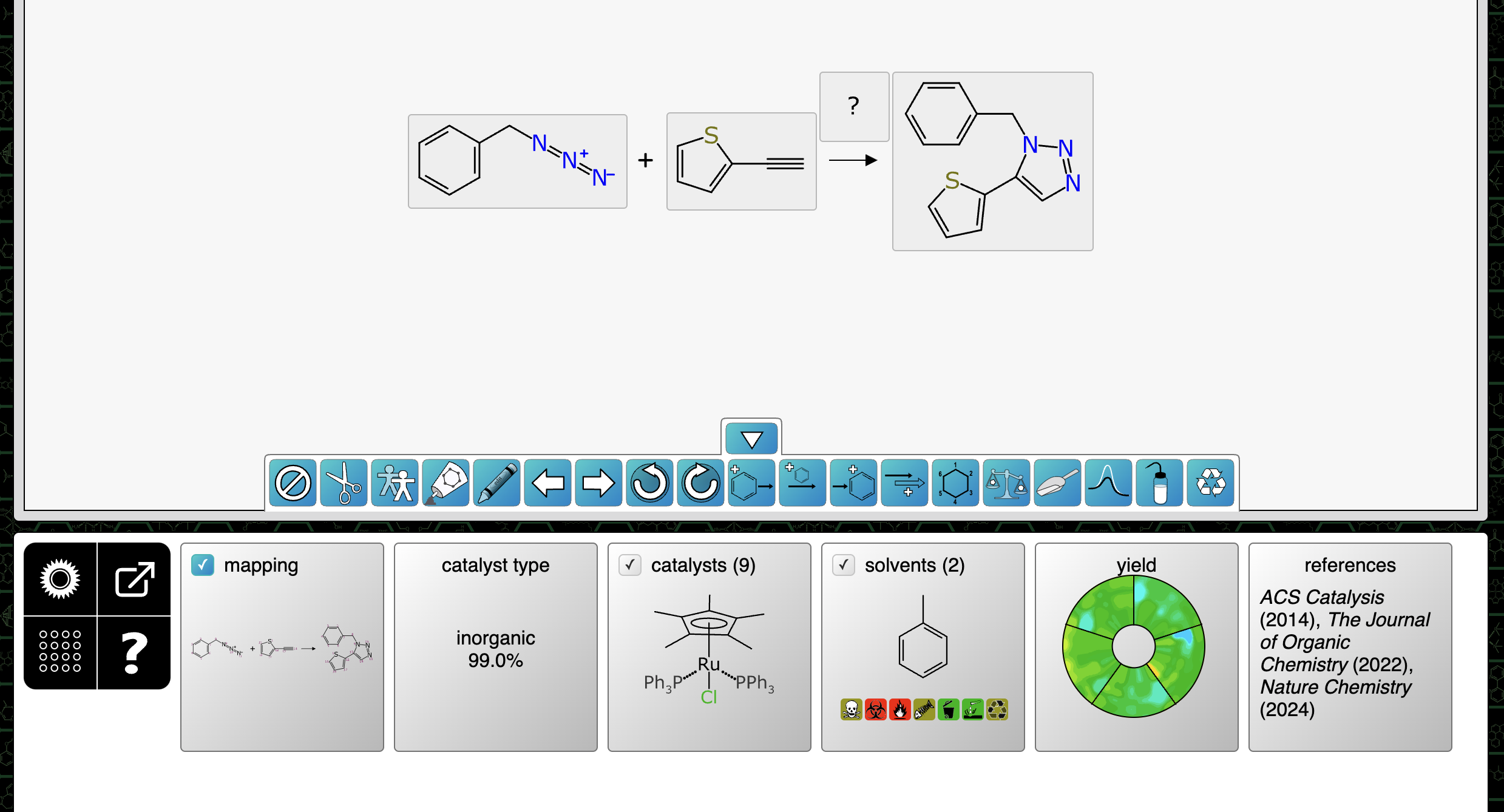 There is a lot going on in the figure above, so let’s establish first of all that we are jumping in right at the middle here. There are a number of actions that happen before the catalyst prediction, and I will describe them in later articles. The reaction engine takes the basic input from the user – which in this case is one reactant, one reagent and one product. It grinds through several preparation steps, and these can be seen in the cards that are arranged from left to right under the scheme: atom mapping; ascertaining that the triphenylphosphine shown above the arrow is in fact a stoichiometric reagent rather than some kind of bystander; and proposing a most likely byproduct.