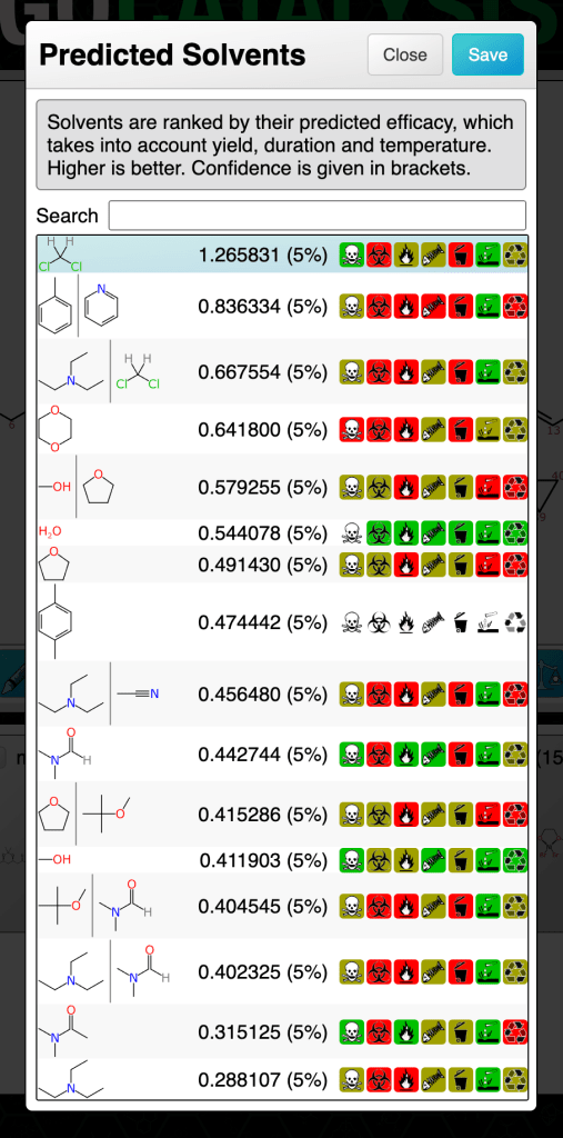 The screenshot above shows the predicted solvents for a partially specified coupling reaction. Note that because catalysts are proposed first, the solvents are fed into the model based on the assumption that the highest ranking catalyst has been selected. The list will be recomputed and re-ranked if a different solvent is chosen.
