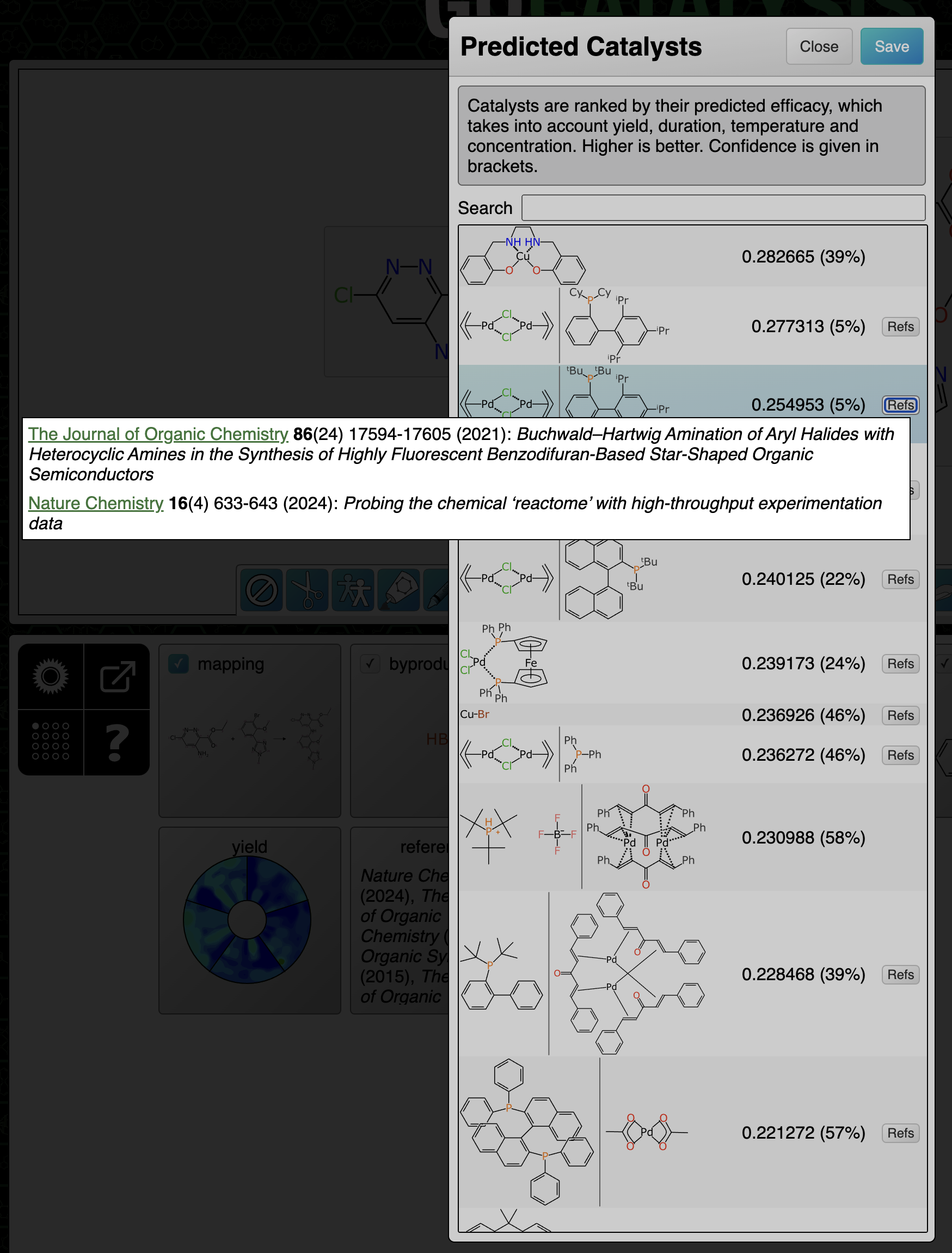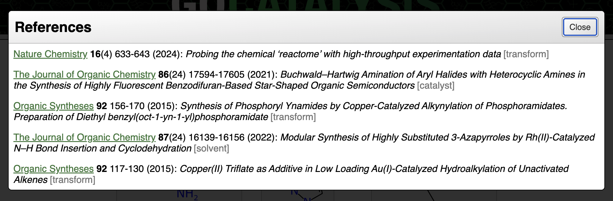This functionality is very useful for deriving a justfiable rationale from a prediction, on a case by case basis. Most of the references are to articles that describe a series of reactions, but they do tend to be closely related, especially for catalyst method papers, so the theme is usually applicable to the task at hand. It can also be useful for just doing a direct reaction lookup, although the total amount of data behind the scenes is a tiny fraction of the overall literature.
