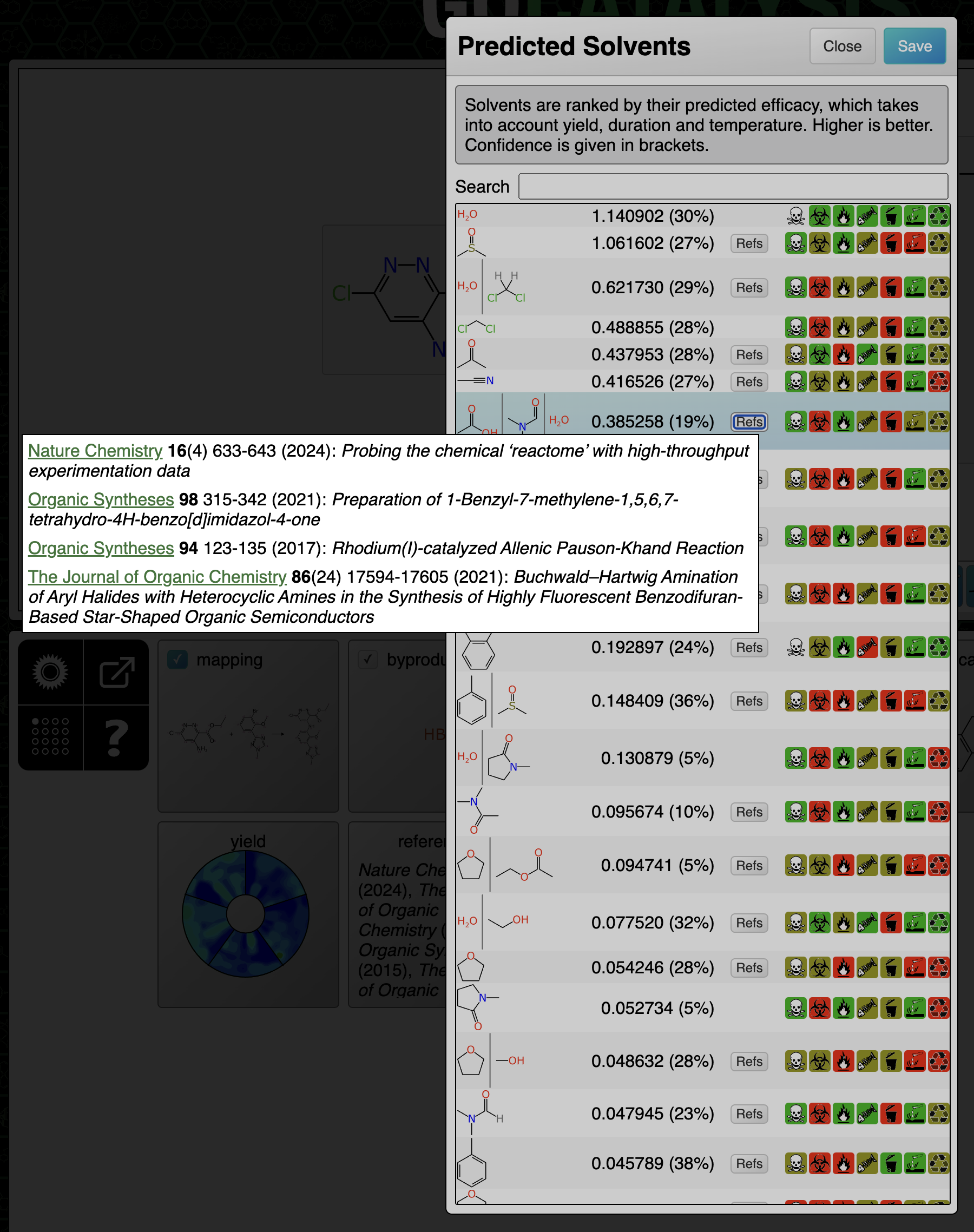 At the end of the prediction sequence, the hypothetical reaction that would’ve been composed if all of the top ranked suggestions were applied, is compared to everything in the training data. The results are divided up based on the attribute that was found to be most similar, e.g. because of similar catalyst, similar solvent or similar transform:
