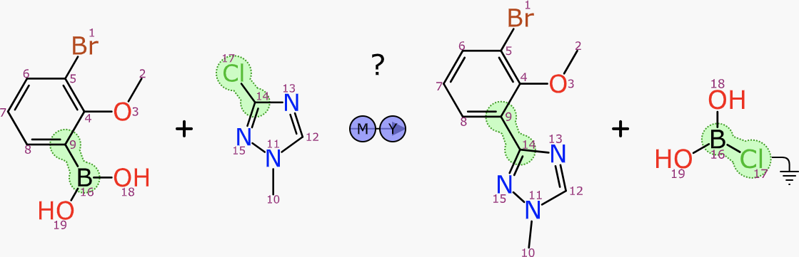 The algorithms described in this article are related, but approach the problem differently. Each and every reaction in the training set is an exemplar that is fully marked up: for the task at hand, it is only necessary for all of the stoichiometric components to be present, which includes reactants, reagents, products and byproducts, and they must be mapped and balanced down to the last atom.
