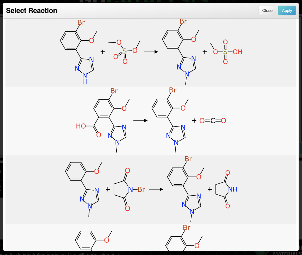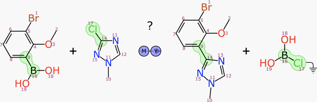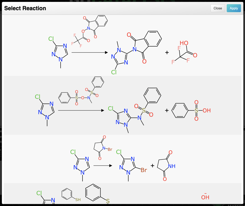 Using models to propose recommendations for chemical reactions is appropriate for many of the steps needed to fill out the scheme, but sometimes it’s more effective to pick an existing reaction and use it as a template to build out the missing pieces. This approach can be applied to forward and backward syntheses (starting from a reactant or product respectively) and also to finding and proposing stoichiometric reagents.