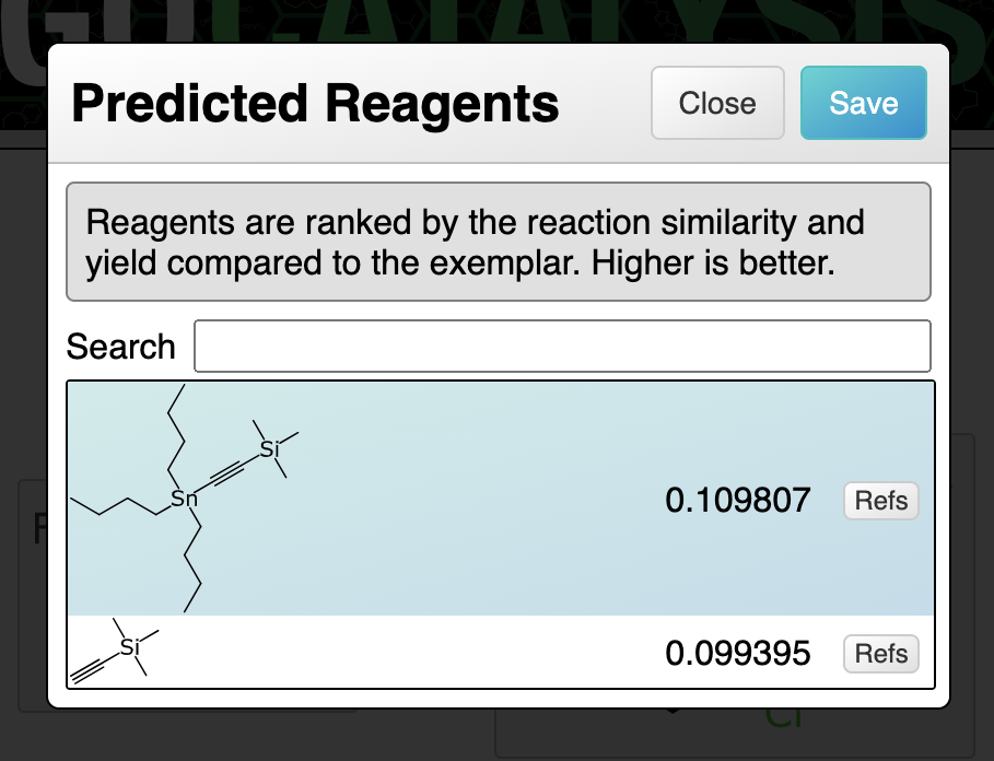 At a glance it may seem inconsistent to use an algorithmic method for selecting reagents, whereas catalysts and solvents are model-based. In actual fact this complex algorithm is really just the pre-filtering method for selecting potential reagents. Catalysts and solvents have their own pre-filtering method, but it is a bit more straightforward. Because the filtering method for reagents is so selective, most of the value is concentrated there. A ranking model for deciding which reagent would work best basically just uses the yields from the matched exemplar reactions to provide a reasonable ordering, which is good enough for now, given that there are usually only a handful of results.