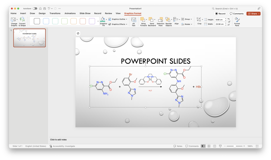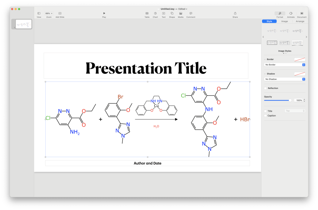 The web tool allows exporting to be done either via the clipboard or by saving to a file. Using the clipboard is the most convenient way of getting the image of the reaction into a presentation tool. For example, copying the PNG image into Keynote (which you probably have if you use Apple products):
