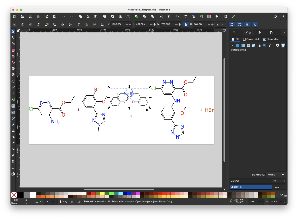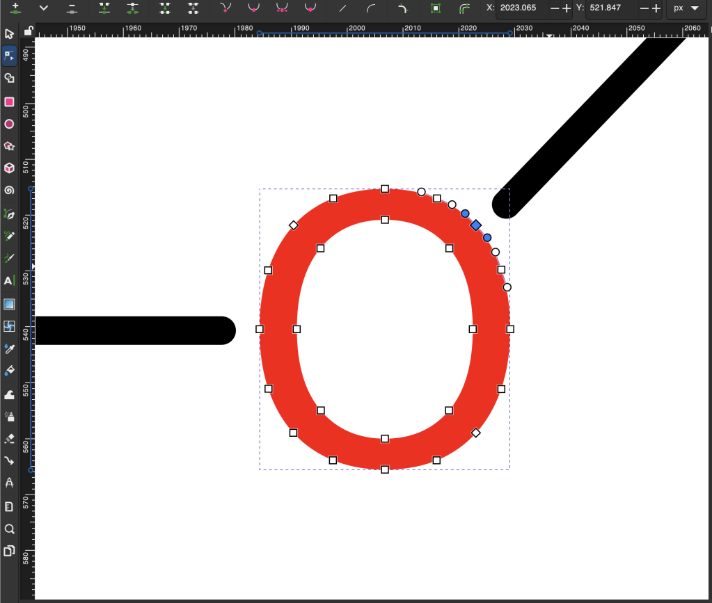 In this very zoomed-in oxygen atom with two outgoing substituents, you can see the selected spline object and its control points, highlighted by the Inkscape editor. Note the identical approach distance of the two bonds. This is the case because the molecule presentation algorithm uses the definition of the glyphs for each alphabetical letter to determine the approach cutoffs, in its quest for calligraphic perfection.