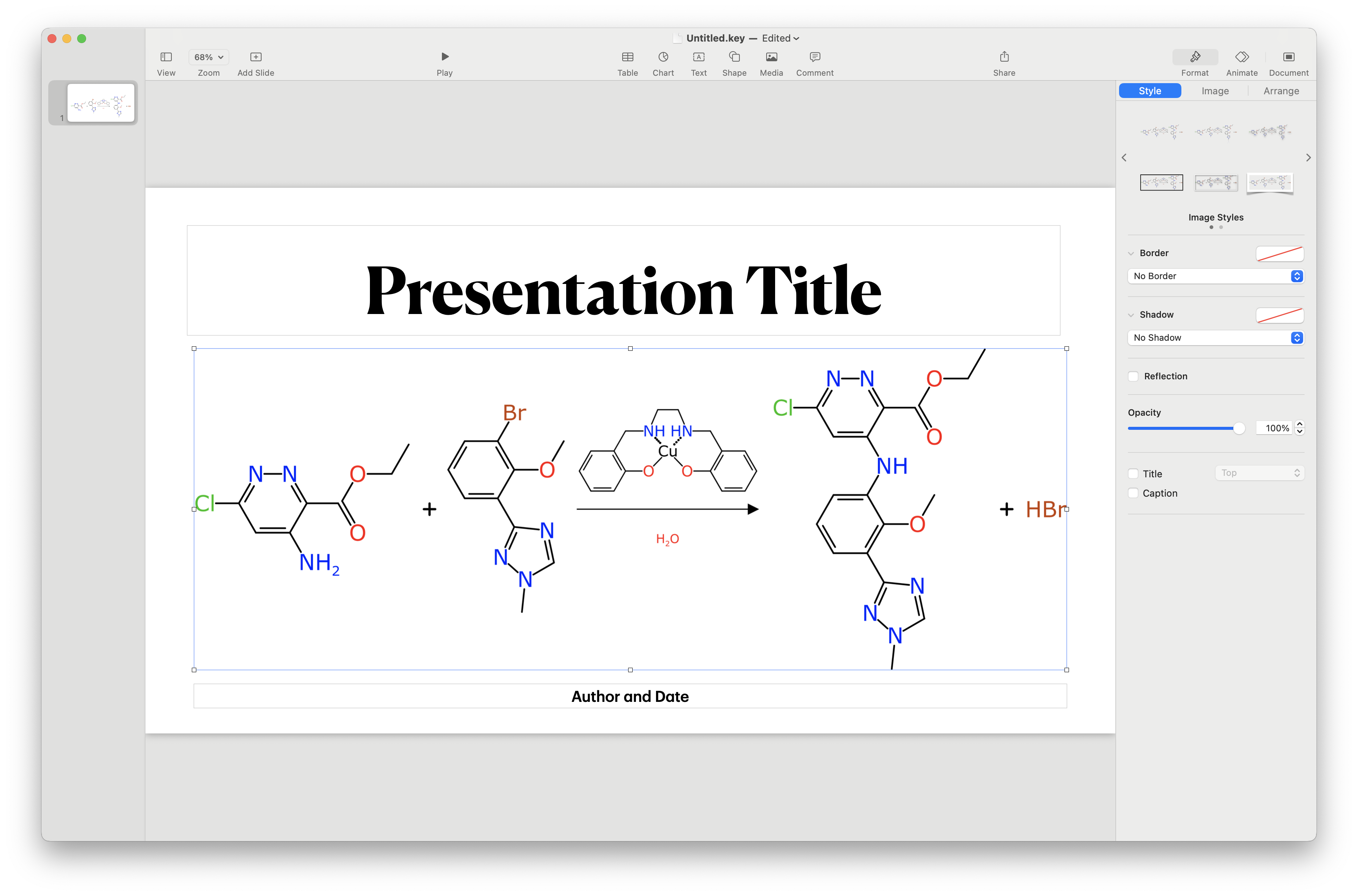 The web tool allows exporting to be done either via the clipboard or by saving to a file. Using the clipboard is the most convenient way of getting the image of the reaction into a presentation tool. For example, copying the PNG image into Keynote (which you probably have if you use Apple products):