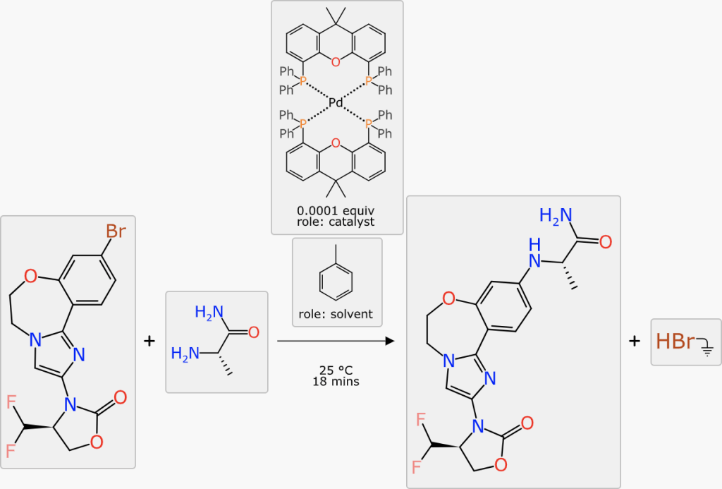 O=C1OC[C@@H](C(F)F)N1c1cn2c(n1)-c1ccc(Br)cc1OCC2.C[C@H](N)C(N)=O>>C[C@H](Nc1ccc2c(c1)OCCn1cc(N3C(=O)OC[C@H]3C(F)F)nc1-2)C(N)=O