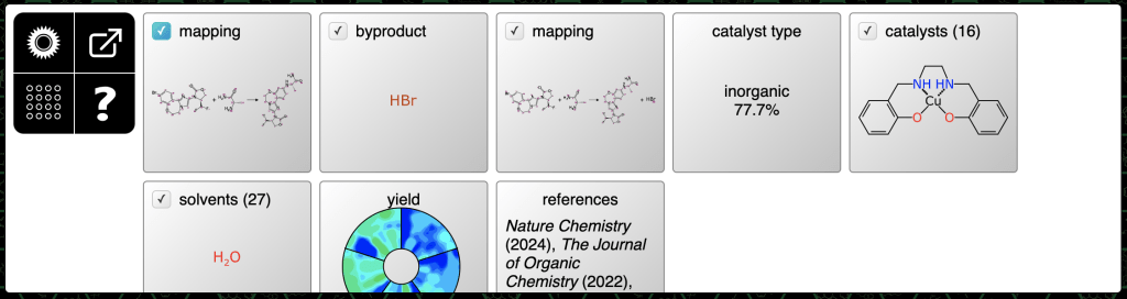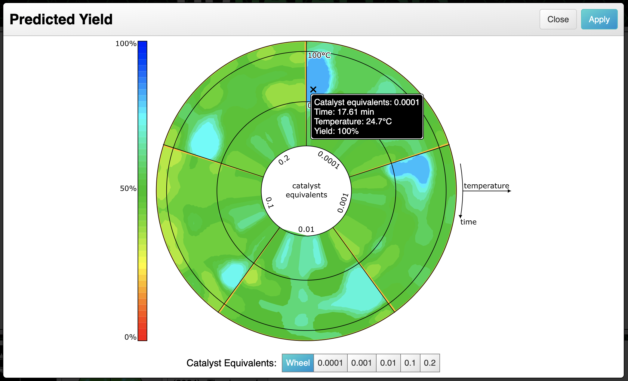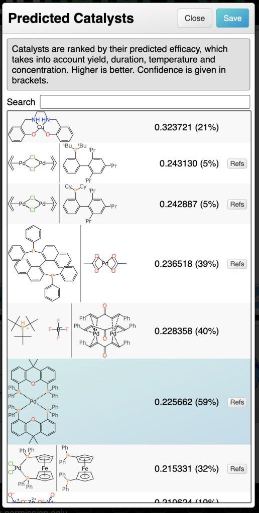 A similar procedure applies to solvents: the highest ranking options are either chlorinated (undesirable) or have a rather low confidence score. Looking further down the list, toluene is an option, and the slightly higher confidence (12%) indicates that there is more training data to back up this choice (note: don’t be tempted to interpret the percentage as the likelihood of it working, it’s an estimation of the reliability of the prediction itself, which in this case will probably be a bit better or a bit worse). Choosing toluene is scientifically reasonable, given the aromaticity and polarity profile of the reactants, products and catalyst (all probably soluble) while encouraging the formal byproduct (HBr) to be somewhere else.
