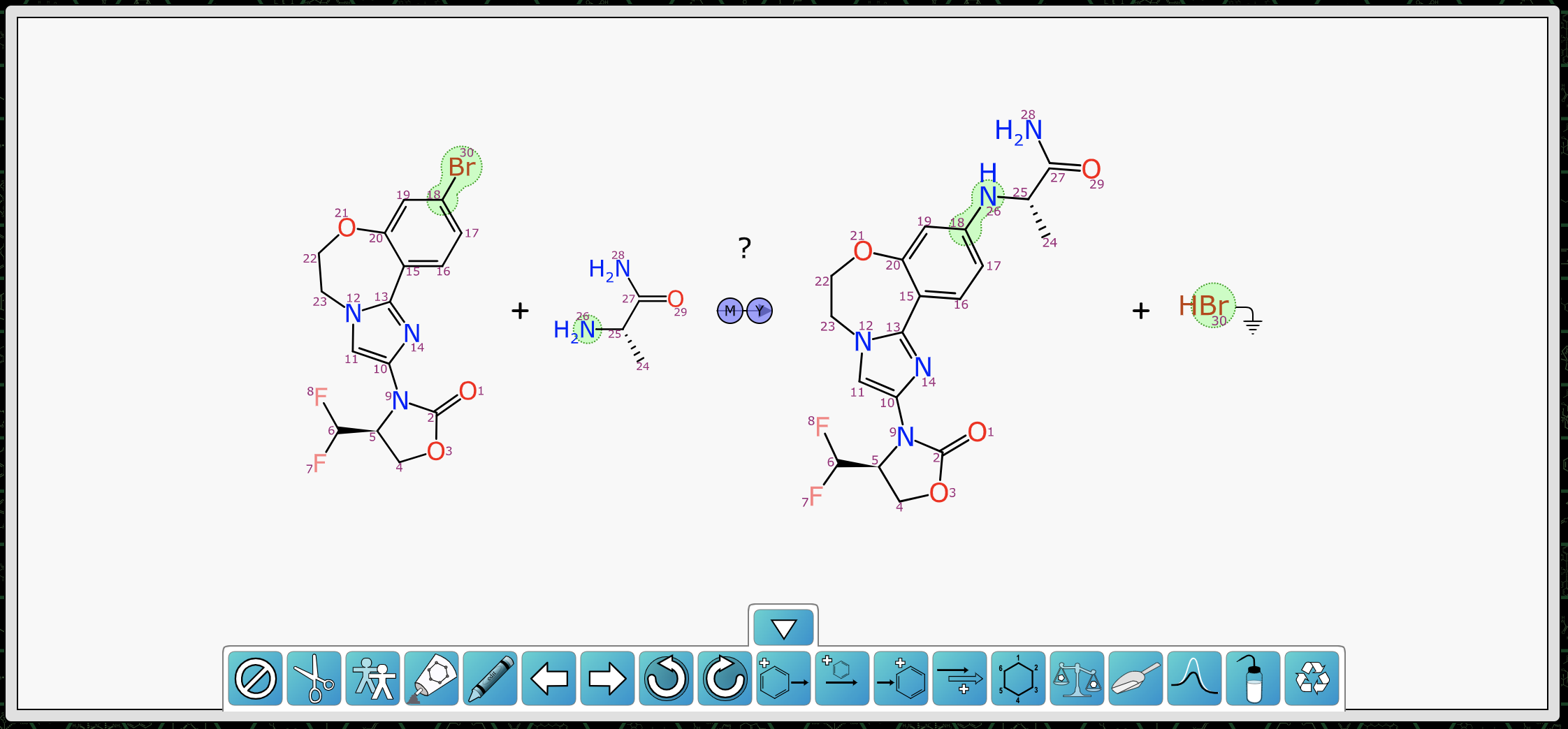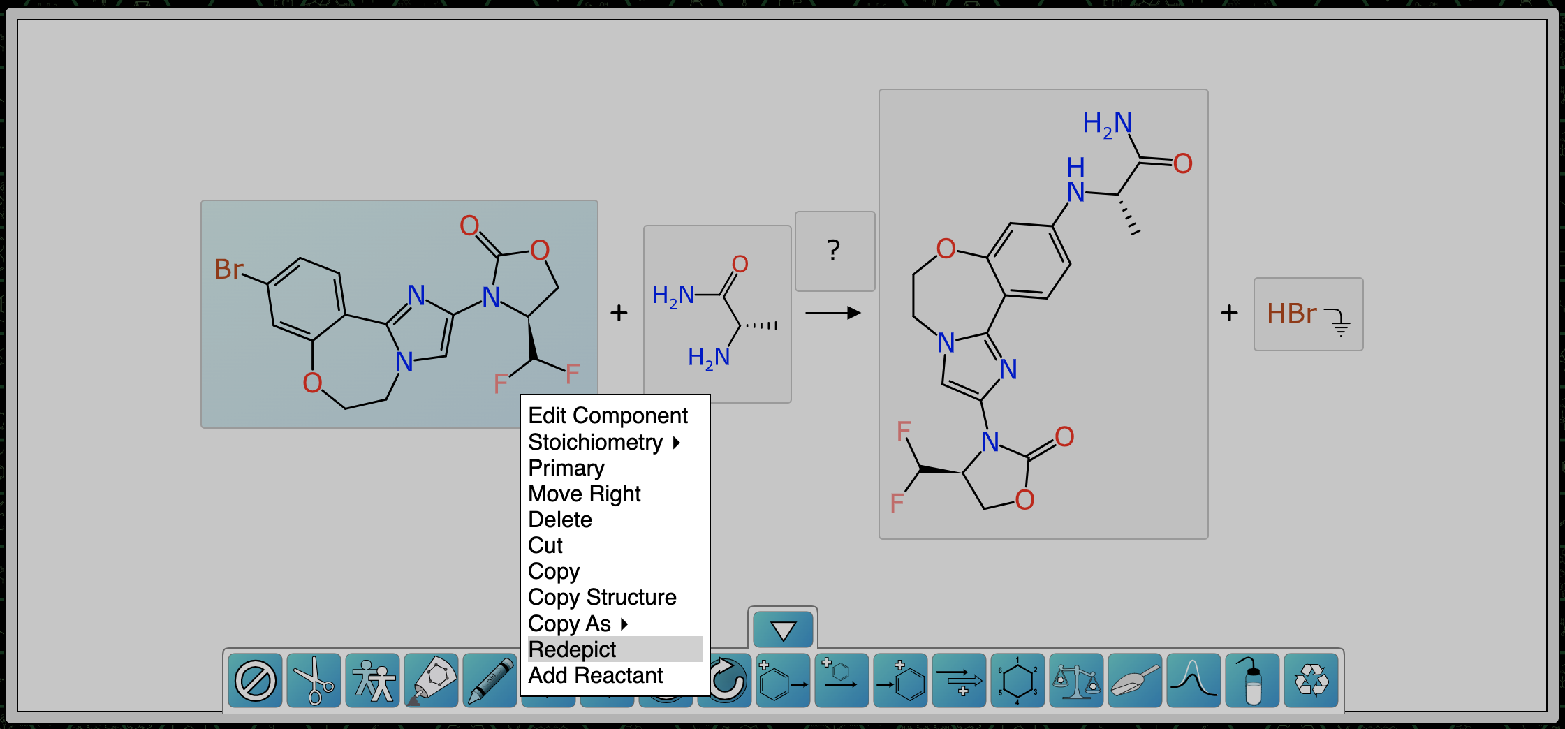 Once atom mapping is done, it is now possible to have the algorithm redraw the components in context – which would have been done automatically if the incoming ReactionSMILES had mapping numbers, but since we assigned them after the fact, we have to ask for it: