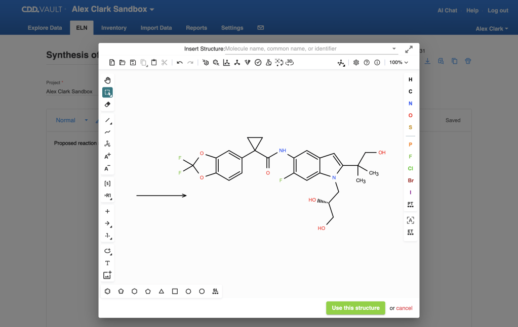 Filling out content for an electronic lab notebook (ELN) is one of the main high value workflows for reaction drawing. This includes drawing the outline of a reaction that is to be performed in the lab and writing up experiments that have been completed. Either way having the reaction scheme as complete as possible, viewable by chemists and meaningful to digital archives, is important.