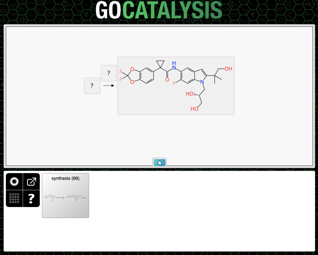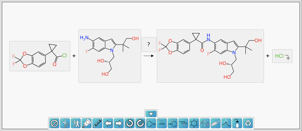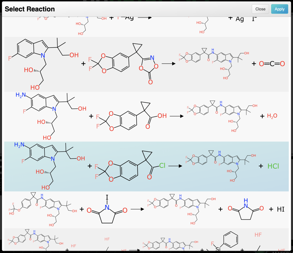 There are quite a few to choose from, which is unsurprising considering how many functional groups the molecule has. Scrolling part of the way down reveals one that looks pretty straightforward, and is highlighted above. Selecting the proposal fills in the reaction scheme: