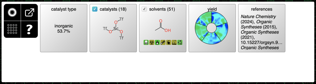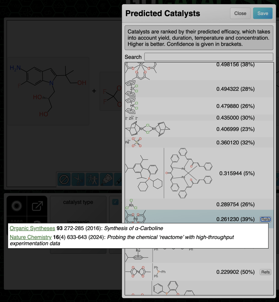 Several rather interesting looking catalysts are given higher rankings, but sometimes the tried and true is more preferable: for this example, I’m selecting Pd(acac)2, which has a higher confidence score than most of the others, and it also has an Organic Synthesis reference, which is usually very informative.