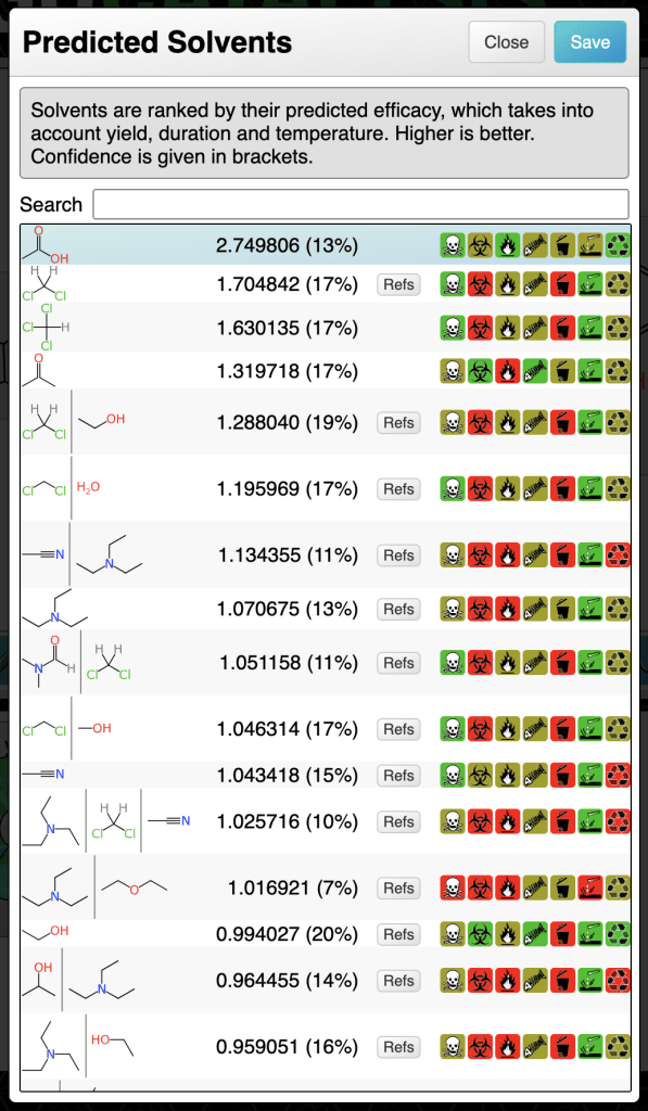 The goal of this exercise is to use the prediction tools to obtain some value, and then get the results back into the ELN with minimal fuss. The snapshot above shows the lower panel populated with the results of the prediction request, which in this case has only carried out one operation: fabricating a list of syntheses that lead to the given product. Clicking on this box gives the full list: