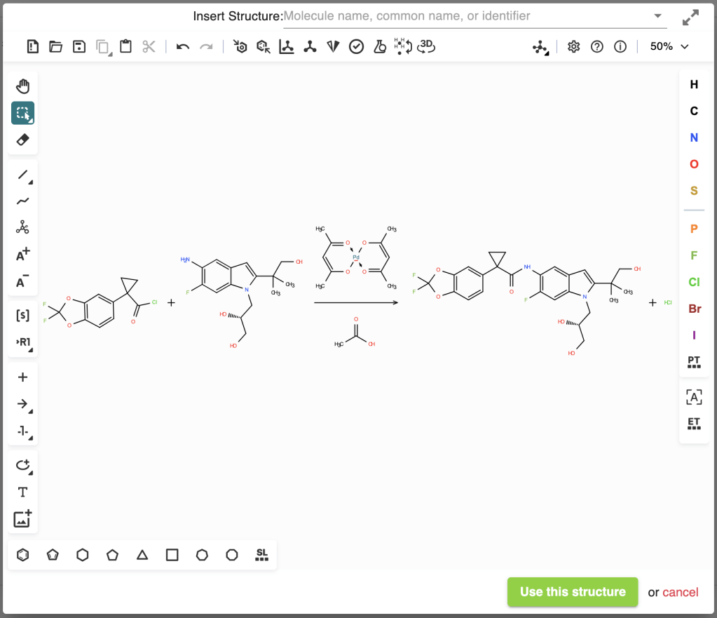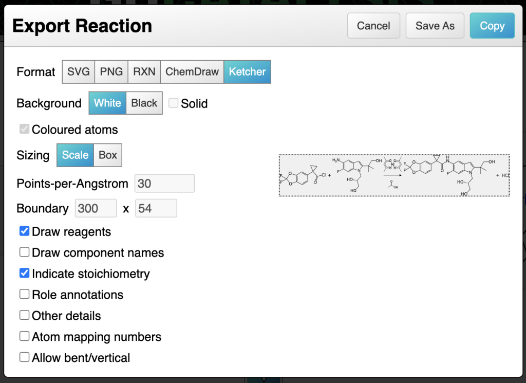 Molecules and reactions are edited using Ketcher, an increasingly popular open source structure editor, which is being actively maintained and improved. The editor operates as per the canvas model, which is another way of saying that when you are drawing a reaction, you need to place the arrows and pluses onto the page and then arrange molecules, text and other drawing objects to your taste. The level of aesthetic control is useful when preparing content for human viewing, but it is not as clearly marked up as a component model (see here for a discussion of the differences).